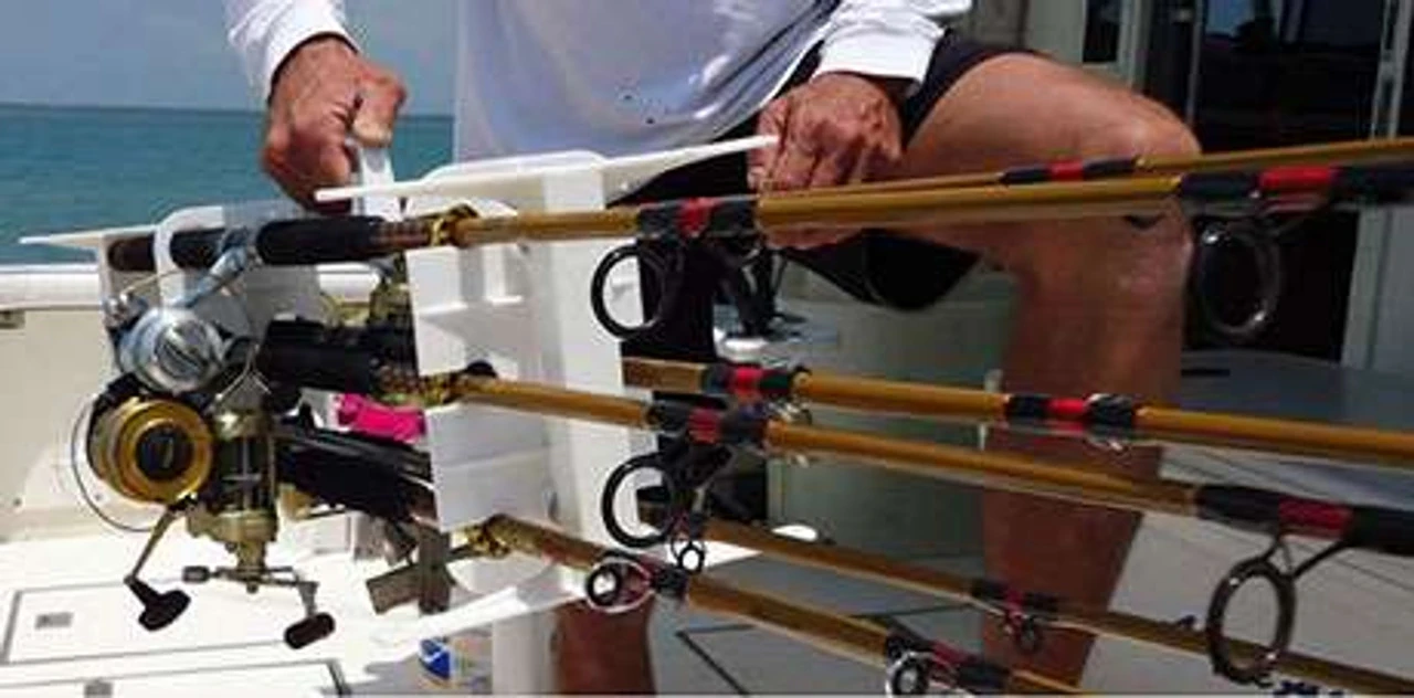 The MD Outdoor Angler’s Tote XL is designed to accommodate up to six heavier rods and reels. Its design features an upper-and-lower bracket system that separates the rods and holds them in position. The grip area of each rod is inserted into one of six holes molded into the lower bracket. The upper end of the rod fits into a matching notch which has been molded into the upper bracket. Once rods are in place, they are secured within the notches by a bungee cord with plastic-coated hooks.