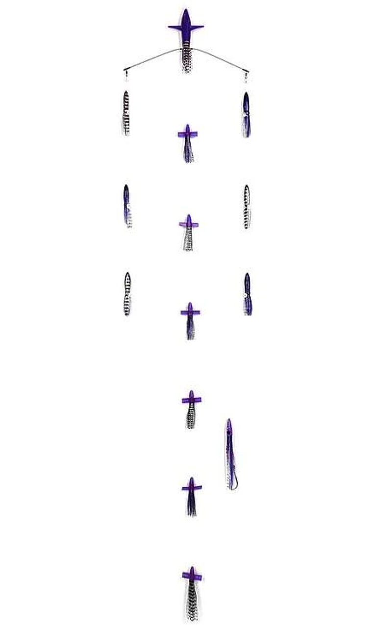 Named for the heavy surface commotion and noisy racket it produces, the Sterling Tackle 18in Chaos Bar w/ 6in Bulb Squid is one of the deadliest straight running spreader bars on the market. Built on a .125 inch diameter high grade titanium bar, these pre-rigged spreader bars are loaded with the perfect combination of soft birds, squid, and rigged stinger to attract pelagics like tuna, dolphin, billfish, and more to your spread. The center line is loaded with six 5 inch soft rattling birds for extra noise and surface splash, while the wing lines feature a total of six 6 inch bulb squids to simulate schooling bait. The rear squids are even fitted with rattles of their own to really ramp up the noise factor. Inside the bottom teaser bird is a 400lb stainless bearing swivel used to attach the 9in Mini-Machine Stinger rigged with tri-beads and a 9/0 4x strong knife edge big game hook. The center line is rigged with 250lb smoke blue Momoi monofilament, while the wing lines are rigged with 200lb. Loop protectors are used on all critical connection points. Each spreader bar comes with its on clear vinyl/mesh lure bag for easy storage and wash down.
